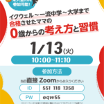 2025年12月25日 / 最終更新日時 : 2025年12月25日 eqwel お知らせ 一流中学から大学まで合格させたママの0歳からの考え方と習慣 1月の無料オンラインセミナーです 1/13(火)10:00~11:10 事前申込不要 ZOOM ID: 551 118 1358 / PW: eqw55