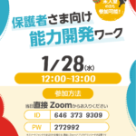 2025年12月25日 / 最終更新日時 : 2025年12月25日 eqwel お知らせ 保護者さま向け能力開発ワーク 1月無料オンラインセミナーです 1/28(水)12:00~13:00 事前申込不要 ZOOM ID: 646 373 9309 / PW: 272992
