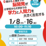 2025年12月25日 / 最終更新日時 : 2025年12月25日 eqwel お知らせ 0歳から3歳までの脳開発で小学校から大学までの学力と人間力が大きく左右される 1月の無料オンラインセミナーのお知らせ 1/8(木)1/16(金)10:00~11:10 事前申込不要 ZOOM ID: 551 118 1358 / PW: eqw55