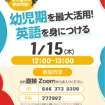 2025年12月25日 / 最終更新日時 : 2025年12月25日 eqwel お知らせ 幼児期を最大活用!英語を身につける 1/15(木)12:00~13:00 事前申込不要 ZOOM ID: 646 373 9309 / PW: 272992