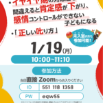 2025年12月25日 / 最終更新日時 : 2025年12月25日 eqwel お知らせ ①イヤイヤ期の対応法を間違えると肯定感が下がり、感情コントロールができない子どもになる ②正しい𠮟り方 1月無料オンラインセミナーです。 1/19(月)10:00~11:10 事前申込不要 ZOOM ID: 551 118 1358 / PW: eqw55