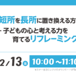 2026年2月5日 / 最終更新日時 : 2026年2月5日 eqwel お知らせ 🌈短所を長所に置き換える方法~子どもの心と考える力を育てるリフレーミング 事前申込不要の無料オンラインセミナーです。 2/13(金)10:00~11:10 ZOOM ID 551 118 1358 / PW eqw55