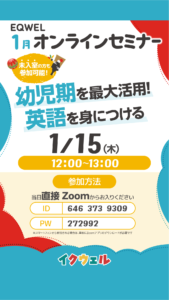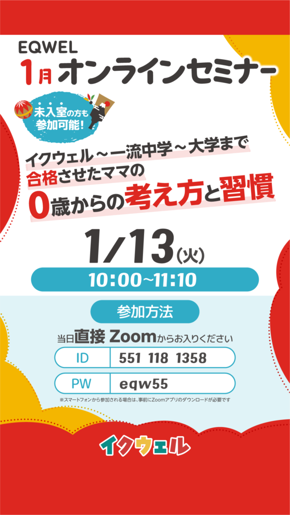 2025年12月25日 / 最終更新日時 : 2025年12月25日 eqwel お知らせ 一流中学から大学まで合格させたママの0歳からの考え方と習慣 1月の無料オンラインセミナーです 1/13(火)10:00~11:10 事前申込不要 ZOOM ID: 551 118 1358 / PW: eqw55 \ 最新情報をチェック / FacebookXBlueskyHatenaCopy コメントを残す コメントをキャンセルメールアドレスが公開されることはありません。 ※ が付いている欄は必須項目ですコメント ※ 名前 ※ メール ※ サイト 上に表示された文字を入力してください。 Δ このサイトはスパムを低減するために Akismet を使っています。コメントデータの処理方法の詳細はこちらをご覧ください。