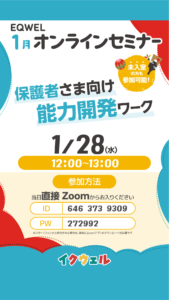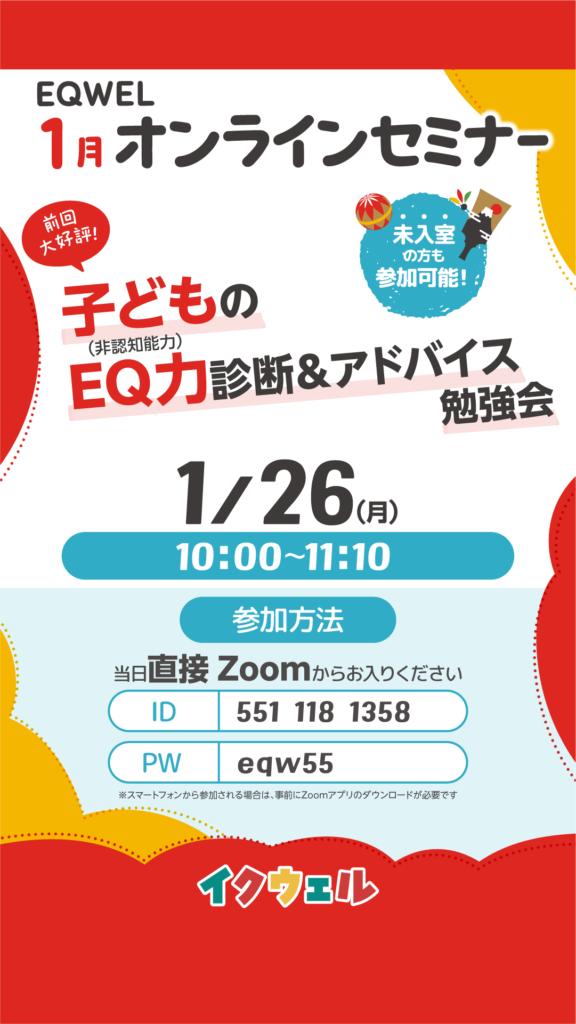 2025年12月25日 / 最終更新日時 : 2025年12月25日 eqwel お知らせ 子どものEQ力診断&アドバイス勉強会 1月無料オンラインセミナーです 1/26(月)10:00~11:10 事前申込不要 ZOOM ID: 551 118 1358 / eqw55 \ 最新情報をチェック / FacebookXBlueskyHatenaCopy コメントを残す コメントをキャンセルメールアドレスが公開されることはありません。 ※ が付いている欄は必須項目ですコメント ※ 名前 ※ メール ※ サイト 上に表示された文字を入力してください。 Δ このサイトはスパムを低減するために Akismet を使っています。コメントデータの処理方法の詳細はこちらをご覧ください。