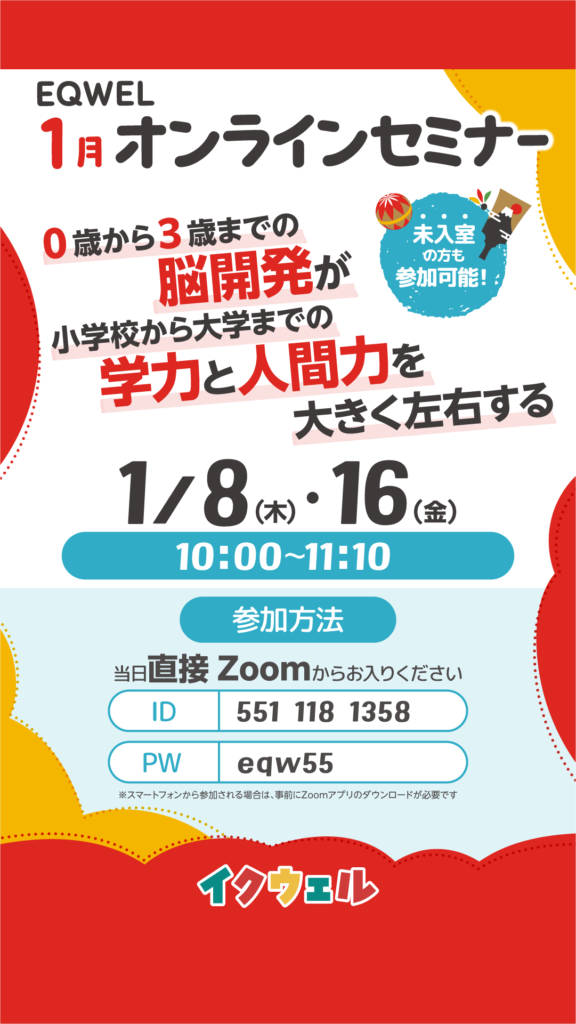 2025年12月25日 / 最終更新日時 : 2025年12月25日 eqwel お知らせ 0歳から3歳までの脳開発で小学校から大学までの学力と人間力が大きく左右される 1月の無料オンラインセミナーのお知らせ 1/8(木)1/16(金)10:00~11:10 事前申込不要 ZOOM ID: 551 118 1358 / PW: eqw55 \ 最新情報をチェック / FacebookXBlueskyHatenaCopy コメントを残す コメントをキャンセルメールアドレスが公開されることはありません。 ※ が付いている欄は必須項目ですコメント ※ 名前 ※ メール ※ サイト 上に表示された文字を入力してください。 Δ このサイトはスパムを低減するために Akismet を使っています。コメントデータの処理方法の詳細はこちらをご覧ください。
